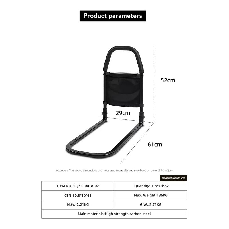 Pasamanos de Cama para Adultos y Mayores - Seguridad y Asistencia al Dormir Aumenta la seguridad y autonomía en la cama con nuestro Pasamanos de Cama. Diseñado para brindar un apoyo firme al entrar y salir de la cama, es ideal para personas mayores, en rehabilitación o con movilidad reducida. Características principales: Apoyo firme y seguro: Proporciona un agarre confiable para levantarse o acostarse sin esfuerzo. Diseño ajustable: Se adapta a diferentes tamaños de camas (individual, matrimonial, queen, king) y colchones de varias alturas. Instalación fácil: No requiere herramientas. Se coloca debajo del colchón y queda firme sin necesidad de perforar. Material resistente: Estructura de acero de alta durabilidad con acabados suaves y cómodos al tacto. Portátil y ligero: Fácil de mover y transportar, ideal para el uso en casa o para viajar. Medidas: 60 cm x 52,5 cm x 28 cm. Mejora la seguridad y la calidad de vida en el dormitorio con este práctico pasamanos. ¡Ideal para facilitar la independencia en el día a día!
